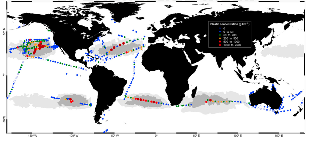 A world map shows concentrations of plastic in the ocean. (Image credit: “Plastic debris in the open ocean.” Cózar et. al.)